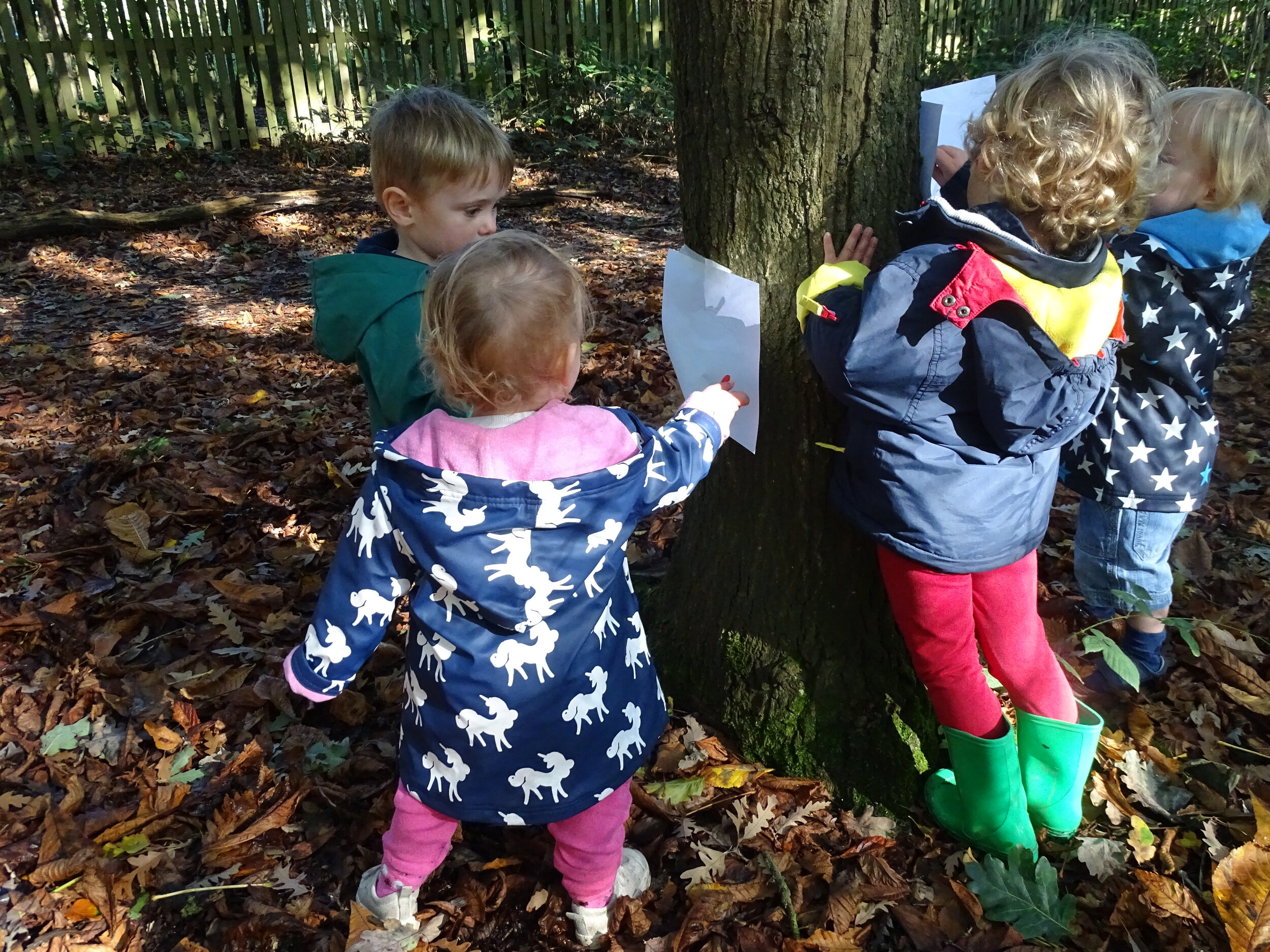 /The older children have been out and about to the park and library. Whilst at the park the children searched for puddles to splash in. Abigail and Zach jumped very high to make the biggest splasheswhich made Zach laugh. Harry and Florence used clay to push on the trees and make some clay faces using the bark as a nice pattern for hair and using sticks and fingers to make imprints for their eyes and mouths. Harry said “Look -my eyes! ” William and Ray explored the bushes, as they went through they felt the different leaves, Ray said “This is soft” and William shouted “Look! a den” and the children began a bear hunt. The children laughed as staff member hid in one of the bushes and jumped out pretending to be a bear making them run back shouting “Bear!”.