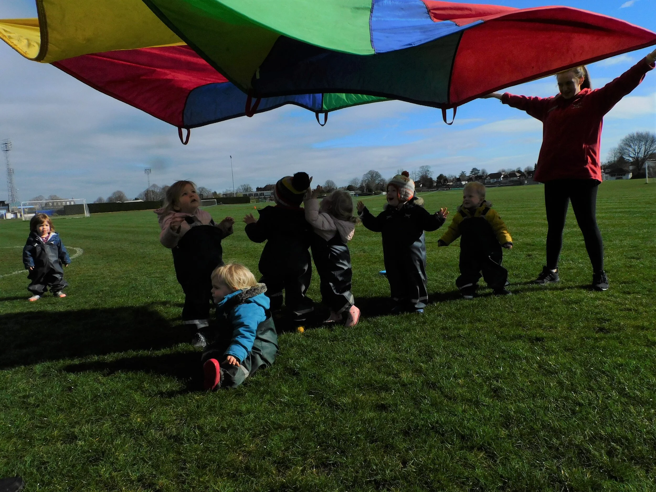 This week, the toddlers took part in an assault course on the field in Imber Court. They had great fun trying to kick the balls into the goal which Charlie was particularly good at. The toddlers then weaved in and out of cones, with Fabian holding a cone as he ran. Ada concentrated really hard when trying this! The toddlers then played some games with parachute. Tomas called the parachute a “flat tent”. The staff were able to completely hide the toddlers underneath, counting to three to reveal their excited faces. They all screamed “weeeee” as the wind blew through their hair. Harry had the biggest grin on his face and Tomas and Sienna kept asking to be hidden again.