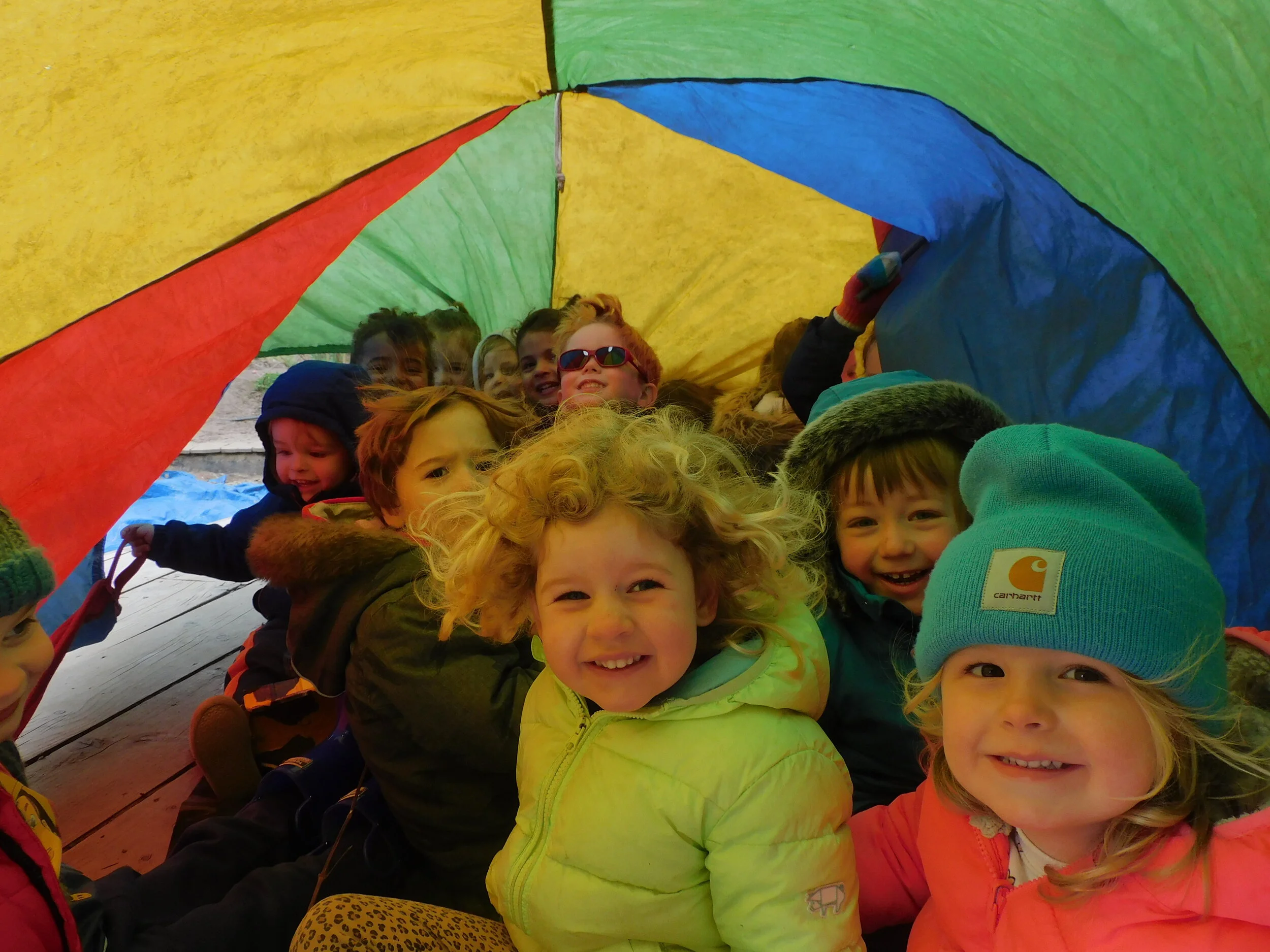 The children also took part in parachute games, counting down, 5, 4, 3, 2, 1 before shaking the parachute very fast and laughing. Oliver then ran underneath the parachute and was jumping up and down. Some of the children followed him under and they all sat down together. Shyla suggesting, “This could be our den to read some stories”.