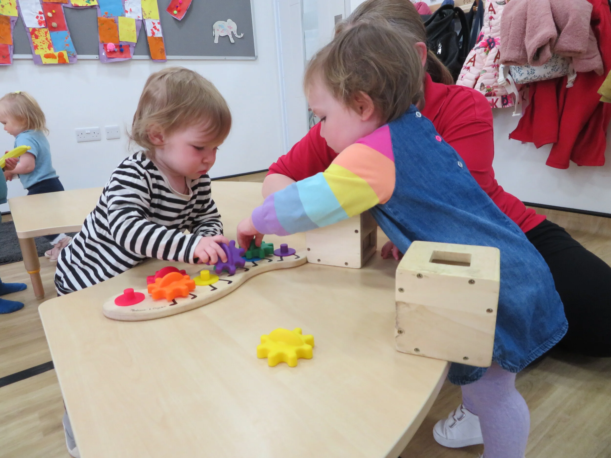 Back inside Finley, Chloe and Olivia explored the play dough. Finley said ‘Tap tap’ as he bashed his play dough with the rolling pin and Olivia pinched at the play dough pulling off small pieces and carefully placing them onto the table. Sadie and Emily played peek a book popping their heads out of the play house shrieking at each other.