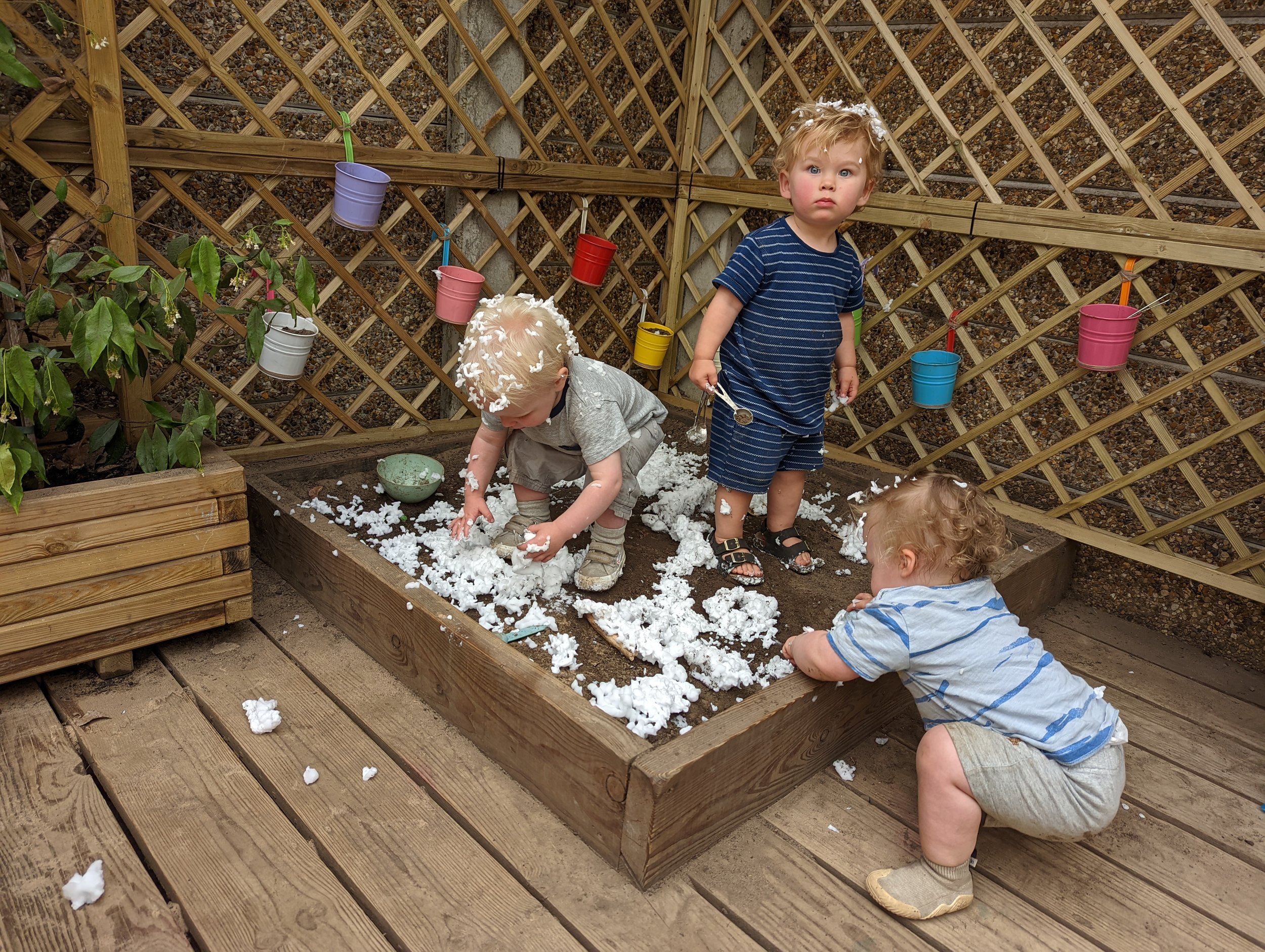 /The toddlers absolutely loved their trip to the stream one morning and were so excited to hear what they would be doing. As they saw spare clothes, wellies, wetsuit trousers and water toys all being gathered and put into the buggies Arlo asked, “Are we going for a walk? In the buggies?” Which Max overheard and celebrated with a cheer, “Go on a walk, Yayy”. As the two were celebrating Arlo watched as their water bottles and a snack were placed into a bag too “We having snack on the walk too, it so tasty”. Once the children had their sun cream applied and hats on they were ready to set off in the buggies and began lots of chatter about vans, trucks and police cars that they might spot along the way. As they arrived at the stream they did some fabulous listening skills as made their way along the bank and sat down beside the stream to have a quick snack. Hugo was munching on a breadstick when he all of a sudden he stopped and shouted, “Ah Duck! Duck!” and pointed down the stream where two ducks appeared. This started a chorus of “Duck” and “Quack” amongst the children along with lots of giggles as Rafe tried to feed one his breadsticks. As soon as snack was finished the children were keen to get going and made their way straight into the water. Harry immediately gravitated towards the cups to scoop and collect water while Arlo chose a net. Arlo dipped the net in and scooped up a large amount of water, giggling as it trickled through the net, followed by a gasp as he saw what was left. He held it out to Harry to have a look who replied “Wow they are little stones… can you tip them out into the water? They go splash” which Arlo did and caused a little splash. Harry was about to pour out his full cup of water but hesitated and asked “Can we put this little water back into the big water?” Whilst pointing at the stream. Once Harry was reassured he could pour it out he turned his cup upside down with a splash. Matilda and Santiago enjoyed holding hands and wading through the water together, slowly making their way along the stream, stopping occasionally to giggle as the water flowed around them. Joseph spent a lot of his time on dry land, choosing to use his hands to investigate the water as he squatted down and used the cups and nets to collect water as it flowed at the edge of the stream. The toddlers spent all morning splashing, scooping, pouring and investigating the stream with the morning finished up by bundling into the buggies and setting off back to nursery for lunch.