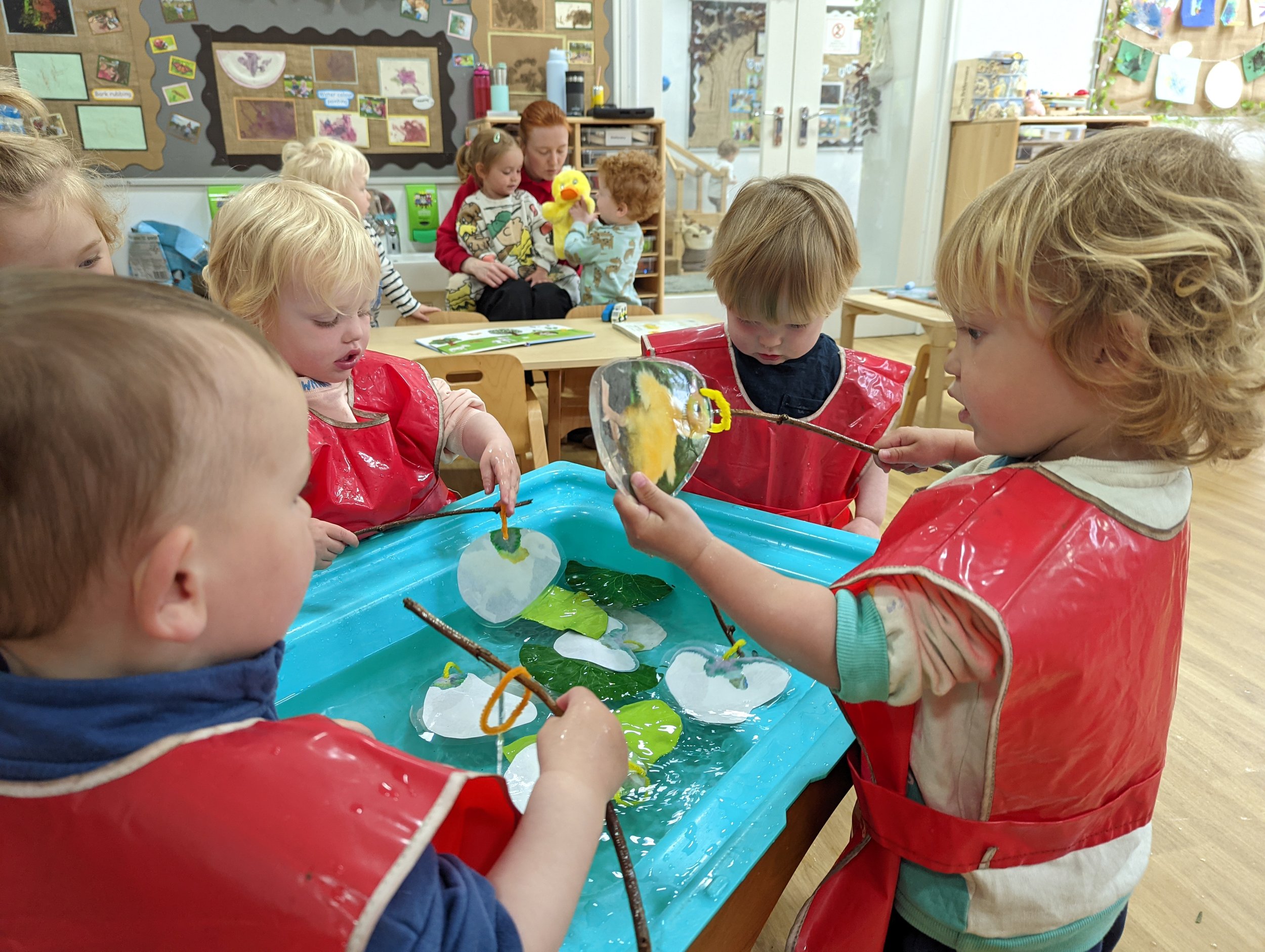 This week, the under 2s have been super excited about the arrival of our duckling eggs. Before the eggs arrived, the children were lucky enough to spot some Moorhen chicks with their Mummy, swimming along the water during one of our daily walks. Lyra pointed as she gasped, saying, “Oooo wow” and began to clap her hands. Once back at nursery, the children visited the duck eggs a few at a time. After explaining to the children that inside the eggs are ducklings, Lowen’s eyes lit up. He looked towards the eggs and said, “Quack quack” with a huge smile on his face as he looked at his friend Calvin. Calvin then began to copy the quacking sound which made them both giggle. Every day the children have a look to see how the ducklings are doing and if they have hatched yet.