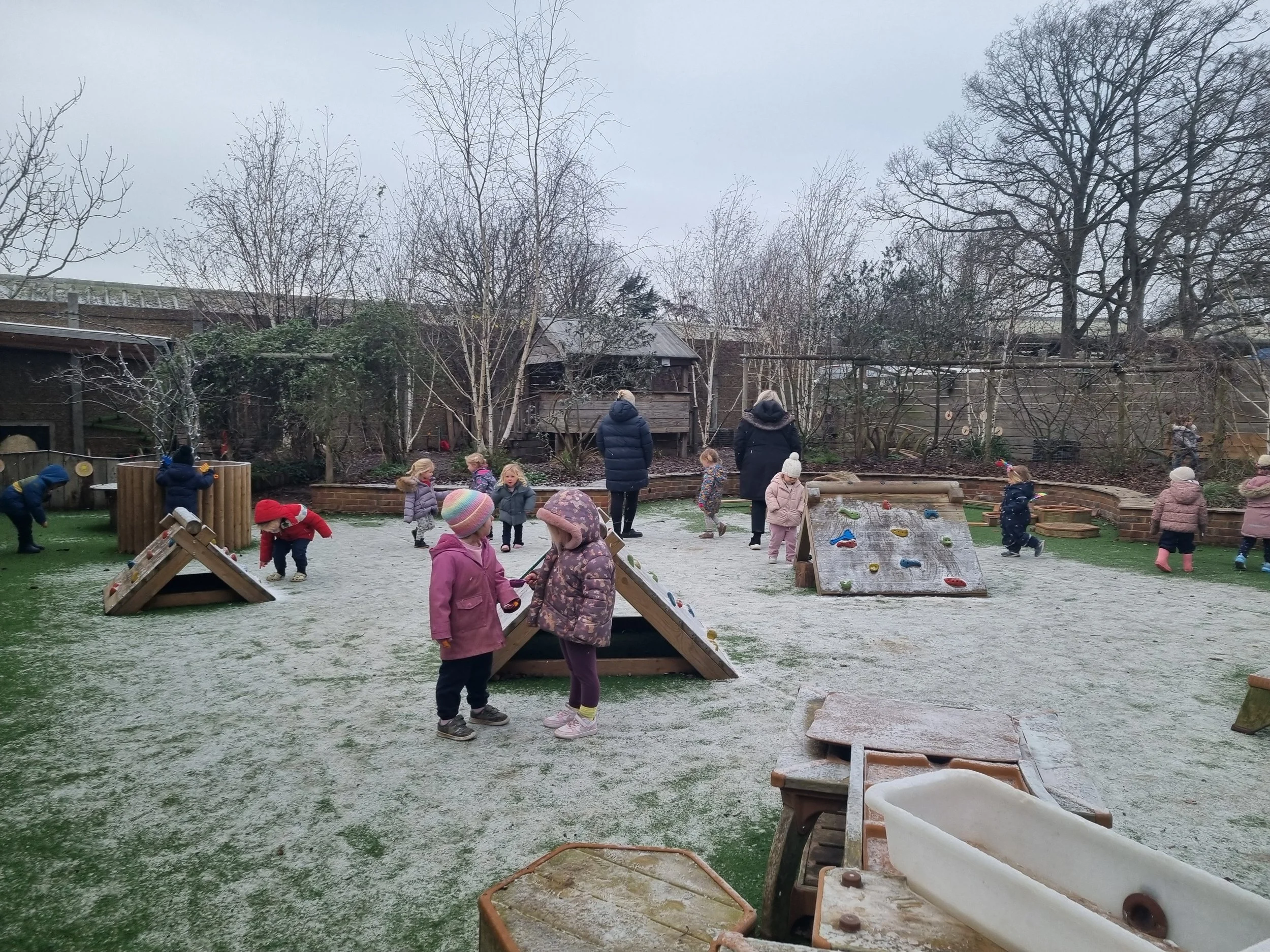 /Happy New Year and welcome back to all of our families! The children have been very excited to see their friends throughout the week after the Christmas break, with some children even running over to give their friends cuddles when seeing them walk through in to preschool. There have been many conversations with different groups of children, discussing what presents Father Christmas brought to them as well as talking about what their Christmas plans were. The children were very excited to return to nursery to see an ice filled garden, some even believing that the snow had set. When venturing outside to the garden to explore, a group of children collected some wooden beams and small blocks and were pretending to go ice skating. There was lots of fun and laughter going on whilst the children were trying to keep their own balance on the ice and also holding on to friends hands to help them keep balanced. Whilst playing in the tree house, some children were decorating it with blocks and rocks and discussing how they needed to decorate the tree house in Christmas decorations so that Father Christmas would know where to go to next year.