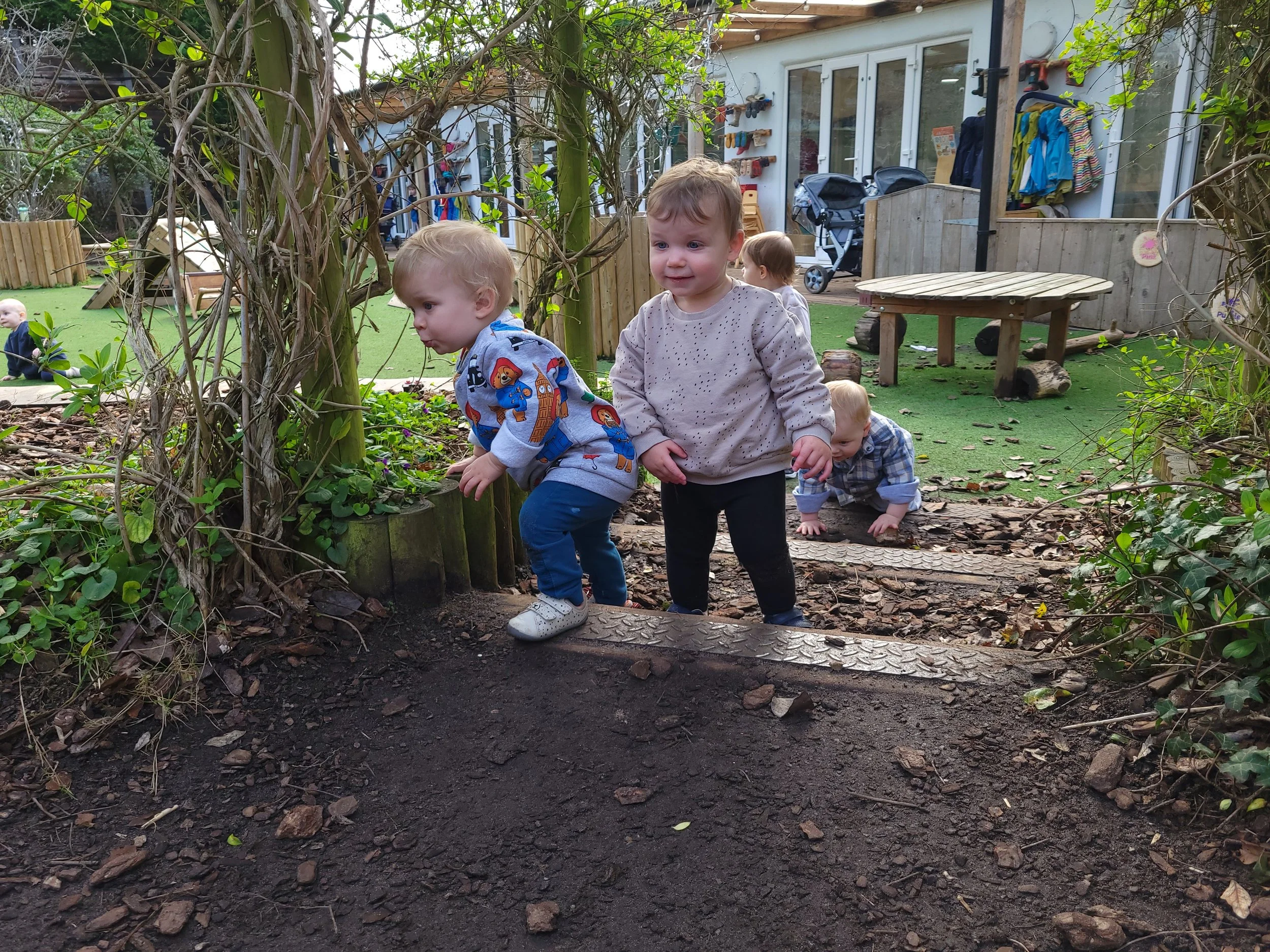 Whilst out and about, we have also noticed the children wanting to explore things further as their minds develop with curiosity. One morning, a few children showed signs of wanting to explore the toddler and preschool garden by pointing over the fence. Since it was a very quiet morning, the gates were opened and off they went into this big, exciting space. Excitement took over as they ran to see what they could find, some choosing the tree house and some heading straight over to the giant sand pit. The route to the tree house involves a path way through an archway covered in greenery, which must have seemed like a jungle for our little under twos! A few of the children began their journey through the jungle and made their way to the tree house, taking one step at a time and smiling with friends. As they got to the bottom of the tree house steps, they were given a helping hand up by a teacher and cheered together, smiling and waving from the top. To celebrate their huge achievement, the children took part in a circle time sing-along involving their favourite song, Hammer Hammer.