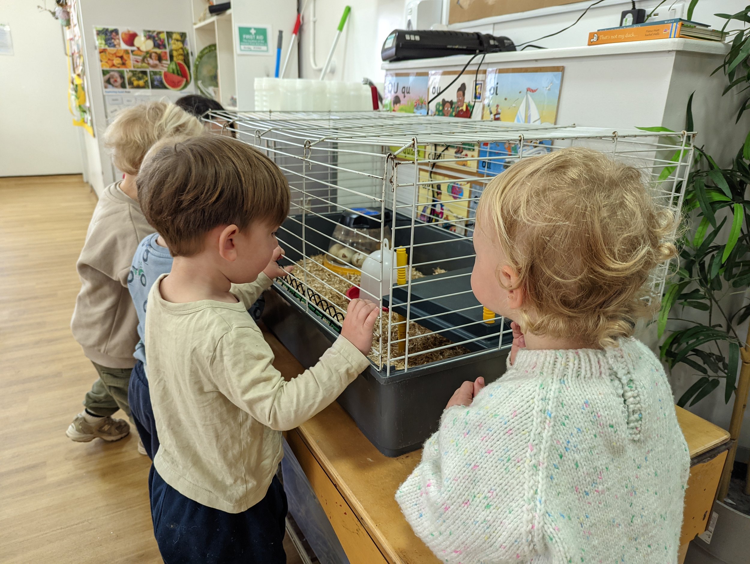 The under 2s have been very excited to meet the ducklings this week at nursery and watch as the eggs begin to shake and crack, and see the ducklings coming out and fluffing up in the incubator. On their way to preschool to visit the ducklings, the Under 2s smiled and looked around showing their excitement brewing. A couple of the children were slightly hesitant when they first saw the ducklings, standing slightly back as they peered into the cage, but after a moment they carefully approached and began to point at them, curious as to what they saw. One of the ducklings opened its beak which made the children giggle. They overheard some of the preschoolers saying “It’s talking, it’s saying quack quack!”, to which the Under 2s began saying, “Quack, quack!”. They have also been able to join in with a duck themed circle time, where the children sang about Old Macdonald’s ducks on the farm, 5 little ducks, and reading through the book of the month ‘Farmer Duck’.